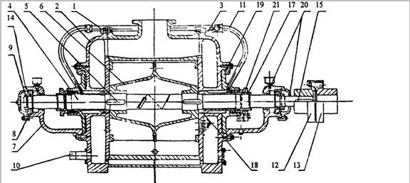 (5)使側蓋上的進氣管和管子(10)脫開并松開示體與側蓋(2)的連接螺釘和泵腳處的雙頭螺栓。在泵體下加墊,然后使側蓋和泵體離開,從軸上取下側蓋(側蓋取下后應將軸支住)。
